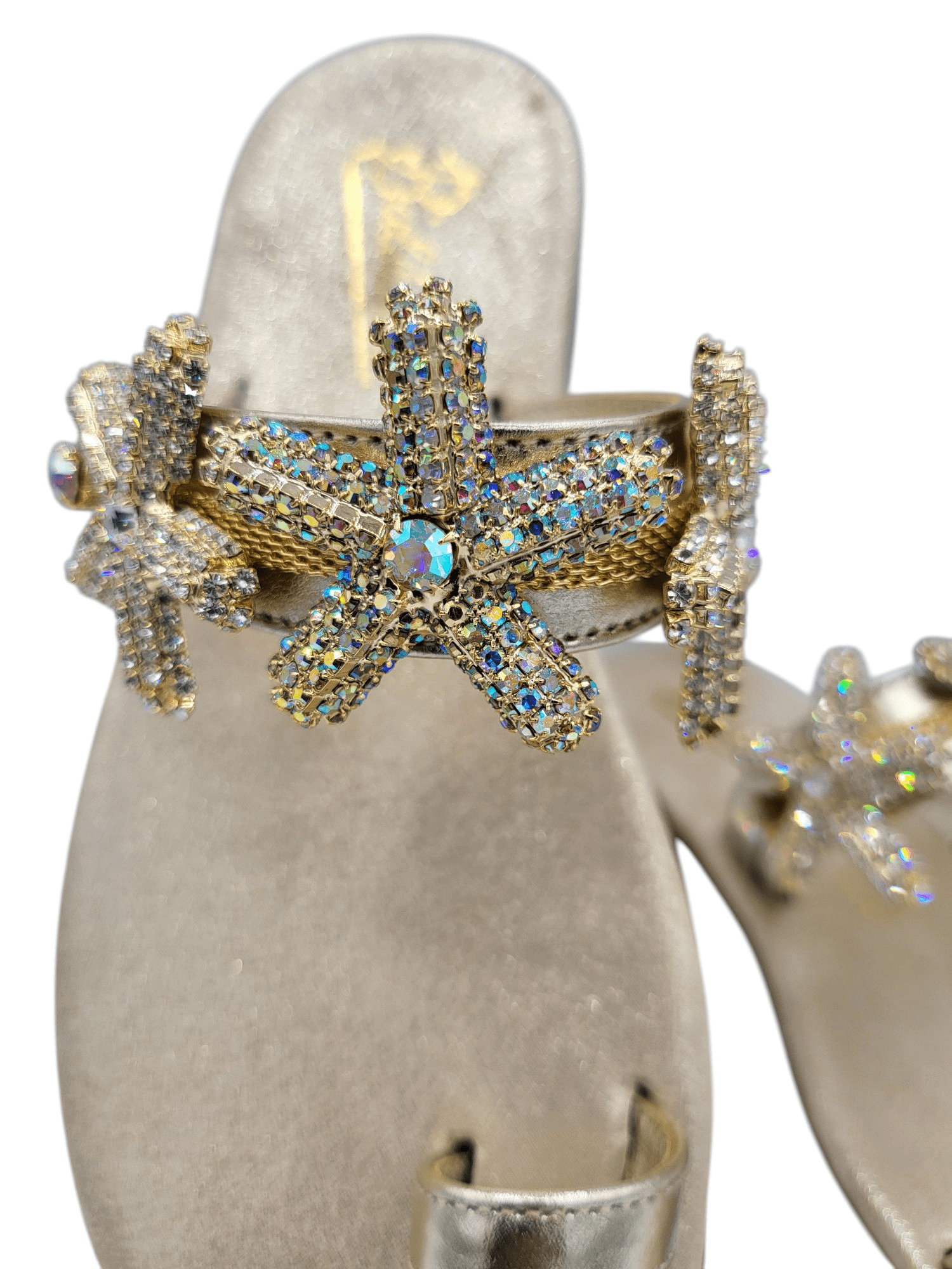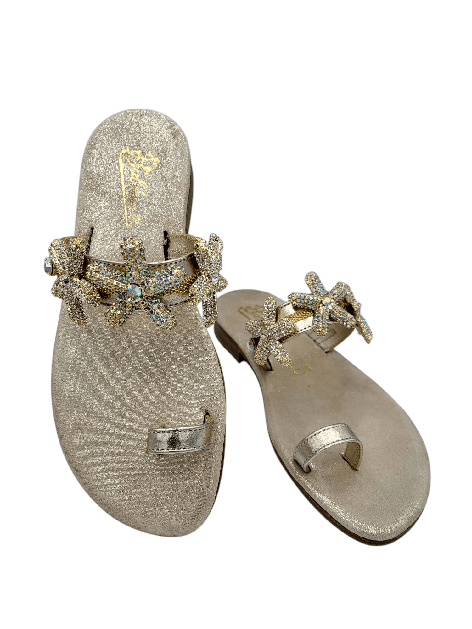 Modello a dito collo, con applicazione gioiello applicata al collo del piede a forma di stella marina e sottopiede imbottito rivestito in pelle, interamente realizzato a mano con materiali e pellami di prima qualità 100% Made in Italy.