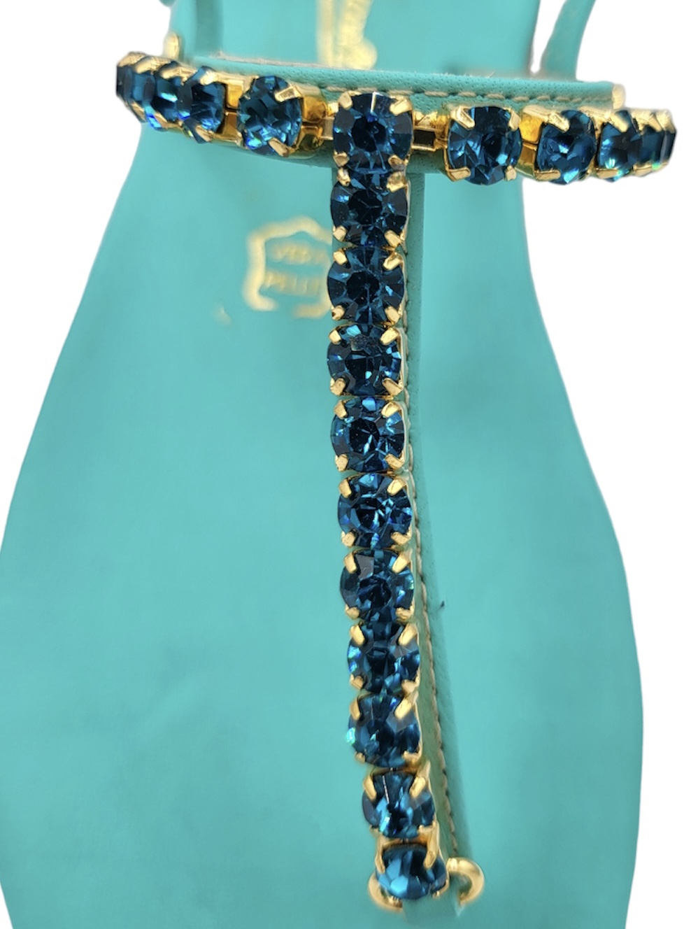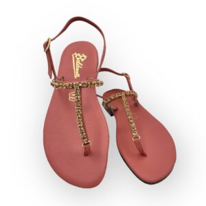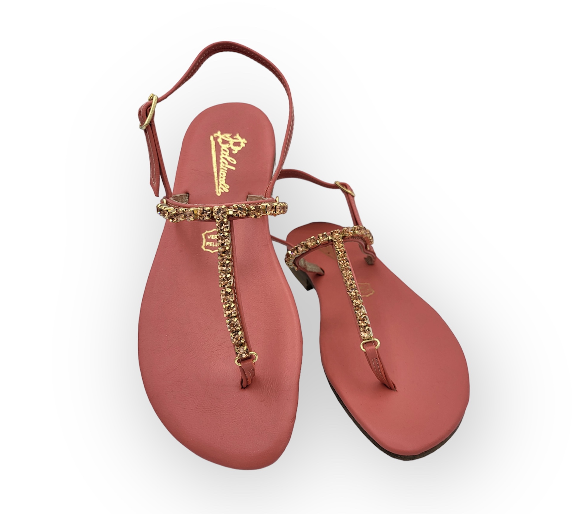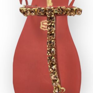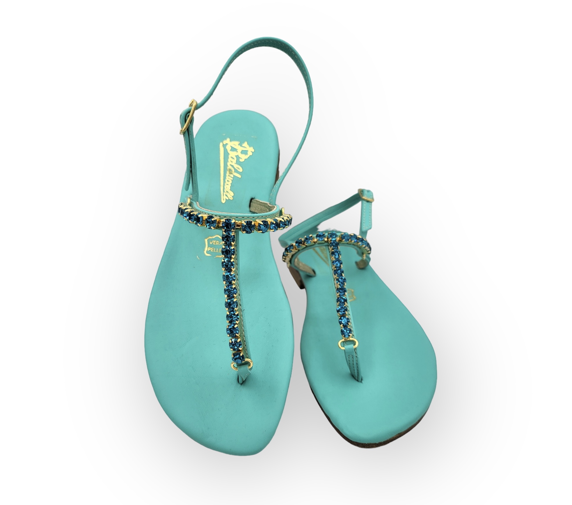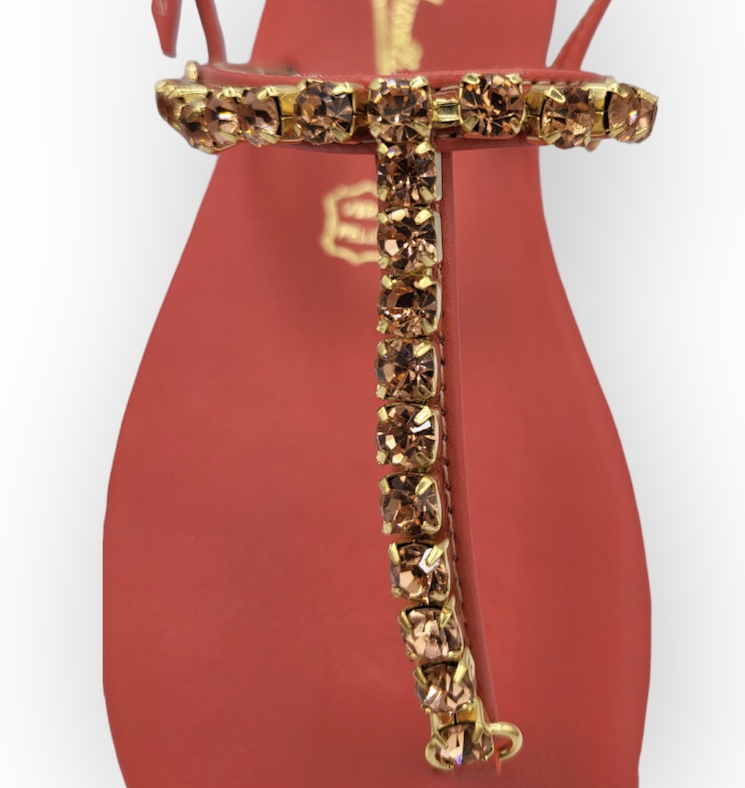 Modello ad infradito e cinturino con applicazione gioiello e sottopiede imbottito e rivestito in pelle, per garantire maggiore confort ed eleganza.Interamente realizzato a mano con materiali e pellami di prima qualità 100% Made in Italy.